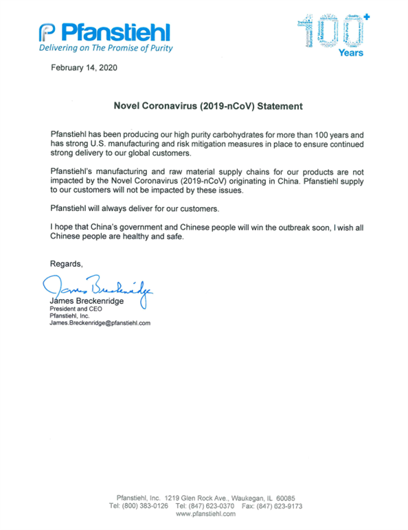 新型冠狀病毒肺炎 (COVID-19) 疫情已發(fā)展為影響全球的公共衛(wèi)生事件,隨著我國(guó)開啟全面的復(fù)工復(fù)產(chǎn),我們的供應(yīng)商Pfanstiehl承諾將一直保持產(chǎn)出并保障供應(yīng)全球客戶。
