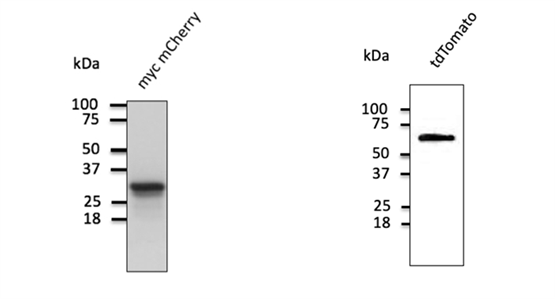 ? ? 西美杰代理SICGEN品牌提供的Anti-mCherry和Anti-tdTomato均為從圓盤珊瑚中提取的紅色熒光蛋白的多克隆抗體。Anti-mCherry和Anti-tdTomato兩種抗體的抗原均是大腸桿菌表達的重組多肽純化而來,用Western blot檢測轉(zhuǎn)染了兩種蛋白的HEK293細胞,分別可檢測到29kda和55kda的條帶。Anti-tdTomato抗體對tdTomato和mCherry均有特異性,但與綠色熒光蛋白(GFP)不發(fā)生交叉反應。???????????