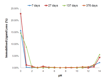 在室溫條件下,在從pH 0.0(1 M HCl) 到pH 14.0 (1M NaOH) 的一系列測試溶液中孵育的APB A6XL的pH穩(wěn)定性曲線。收集上清液樣品并以連續(xù)暴露1周至1年的特定時間間隔測定配基的脫落情況。