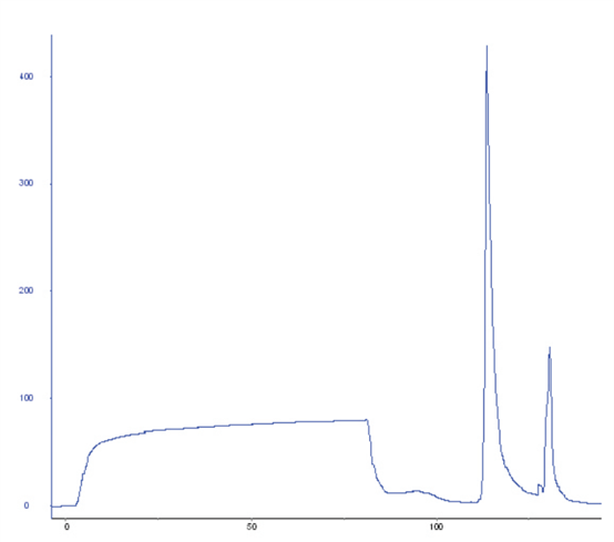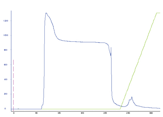 APB層析填料特別適用于糖蛋白的捕獲和純化。下圖展示了一個經(jīng)典的親和純化色譜圖,其中有一個大的流穿和一個小的離散洗脫峰。在50 mM山梨醇洗脫后達(dá)到完全的目標(biāo)糖蛋白回收。