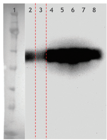 APB A6XL純化的糖蛋白Western blot結(jié)果圖(泳道1 分子量marker,泳道2 上樣到APB A6XL的樣品,泳道3 流穿液,泳道4-8 梯度洗脫液)